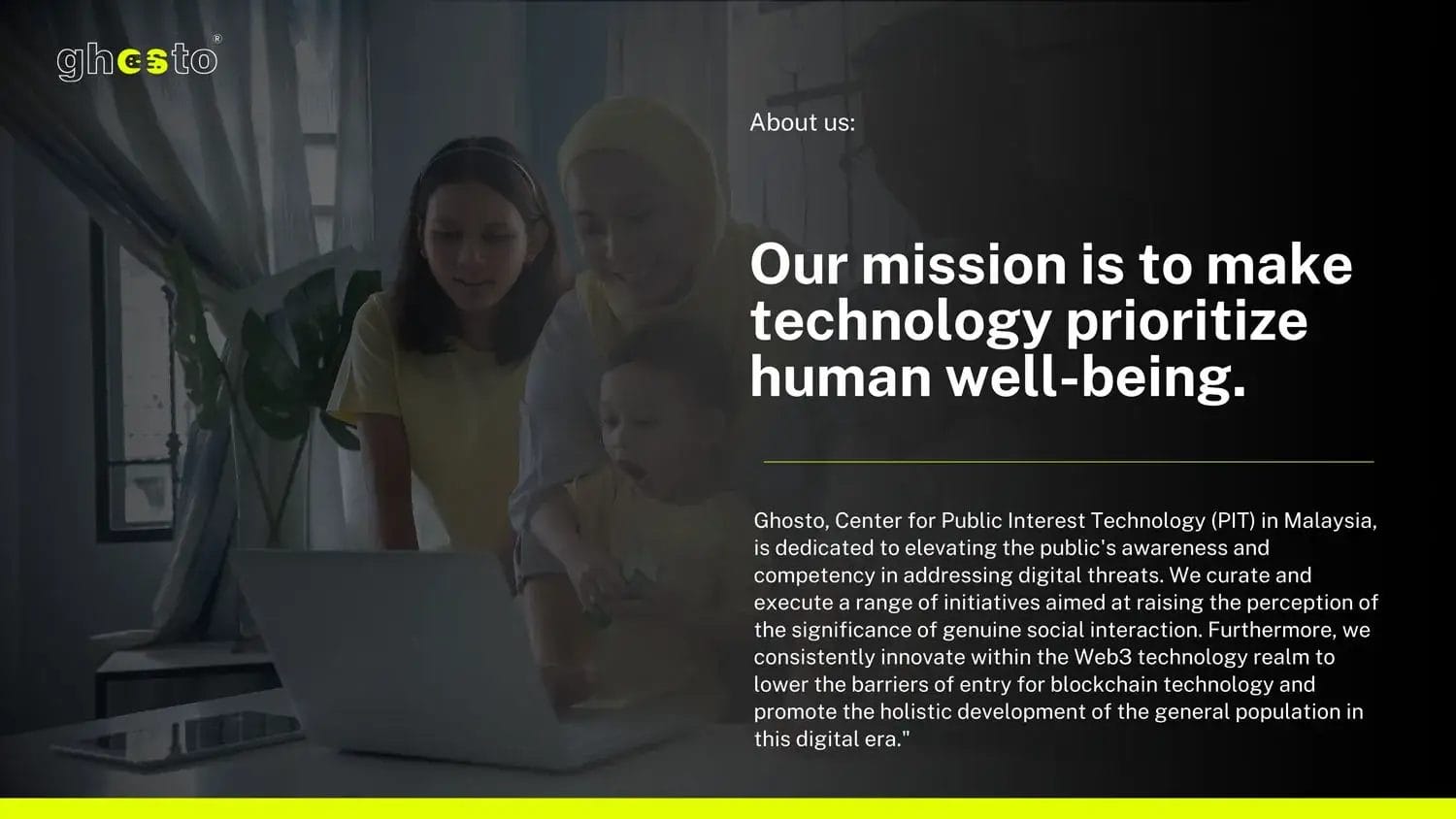 Ghosto 是一家马来西亚的公益技术公司,专注于应对21世纪的数字威胁。通过创新技术和与合作伙伴的合作,我们致力于降低区块链的使用门槛,为下一代在科技时代的成长铺路。